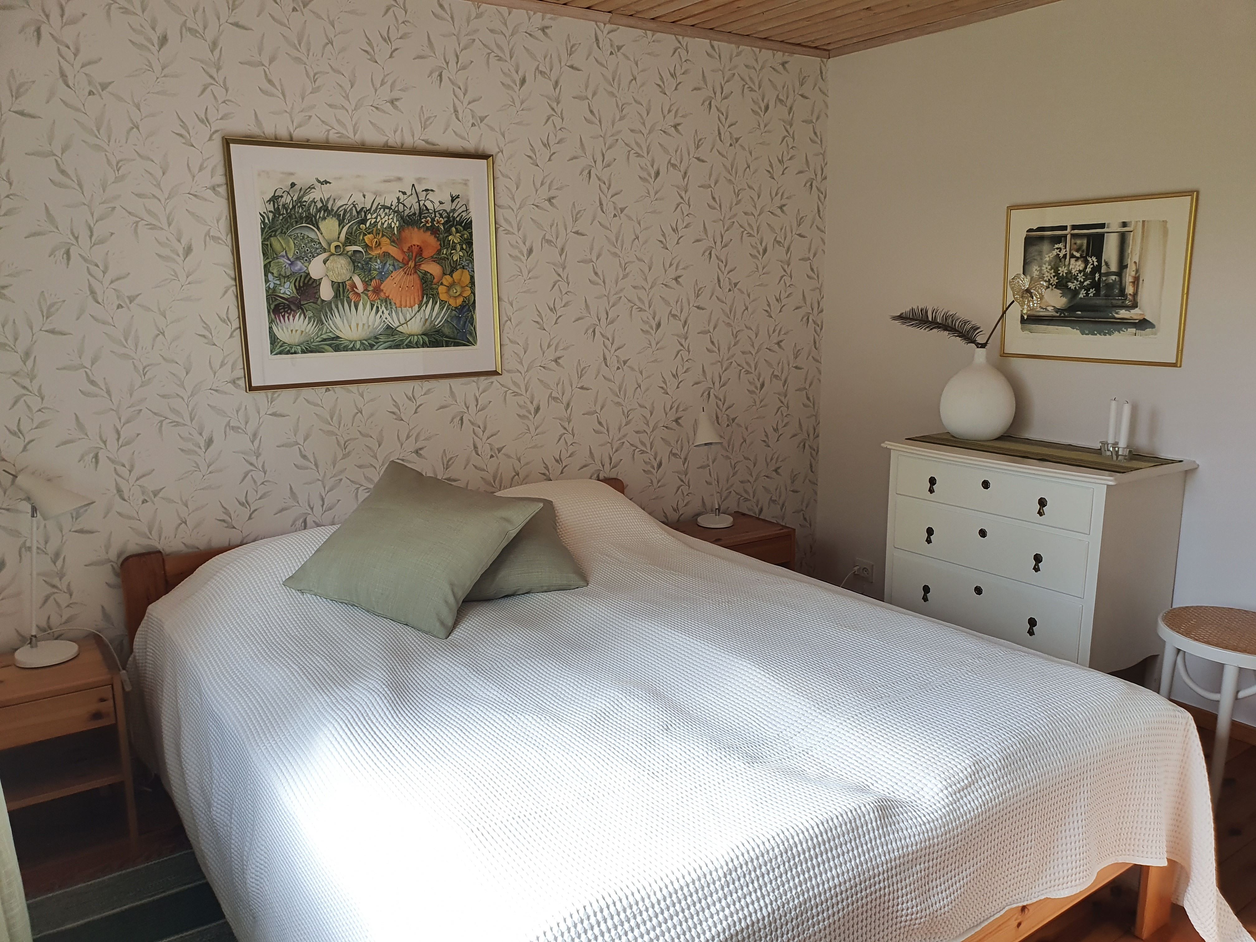 The 74 sqm cottage has a 6 sqm kitchenette with a 4-plate cooker with extractor hood, fridge (186 litres), freezer (124 litres), microwave oven and coffee maker. Large living room with dining area, various sitting areas, TV (Comhem and Chromecast)" and a log stove. Access to a lovely conservatory. One bedroom with a double boxspring bed, one walk-through room with two boxspring beds, leading into a small room with a bunkbed for children (70 x 190 cm).