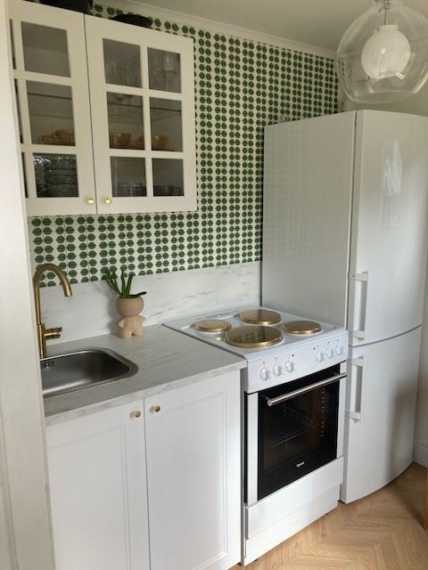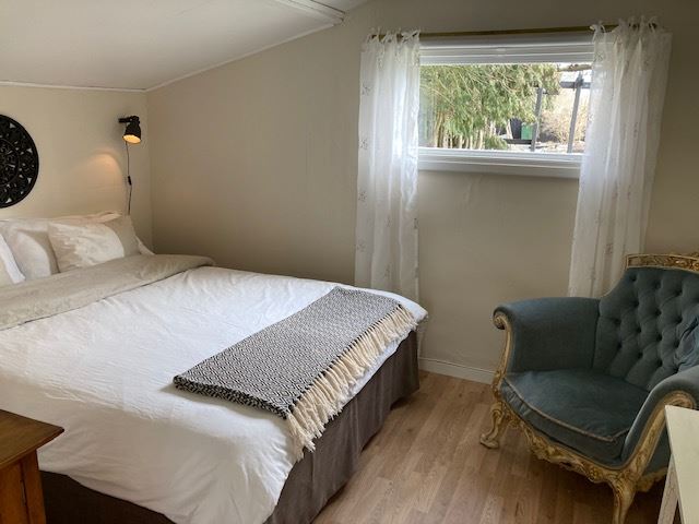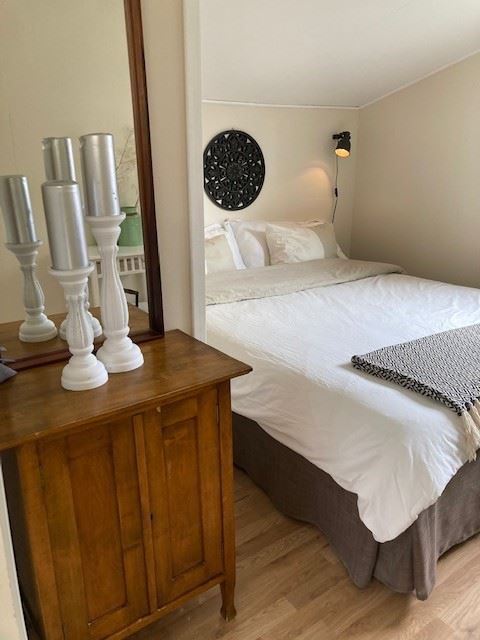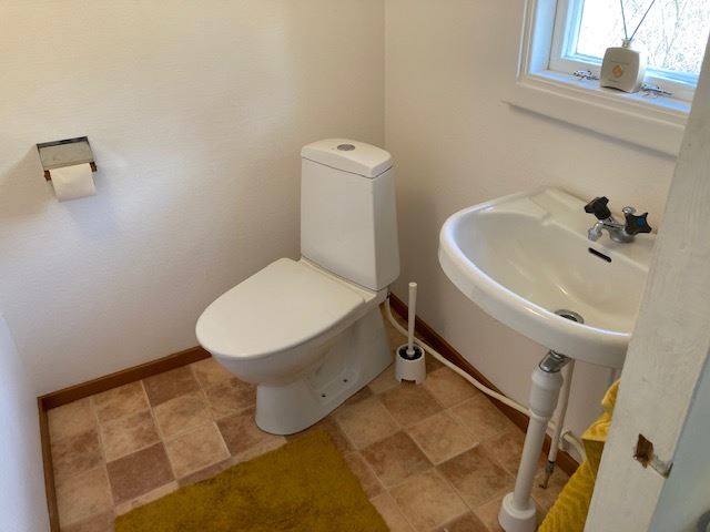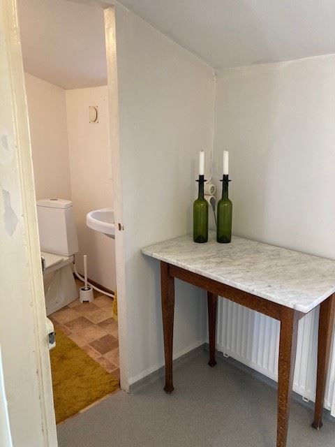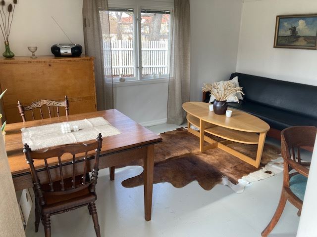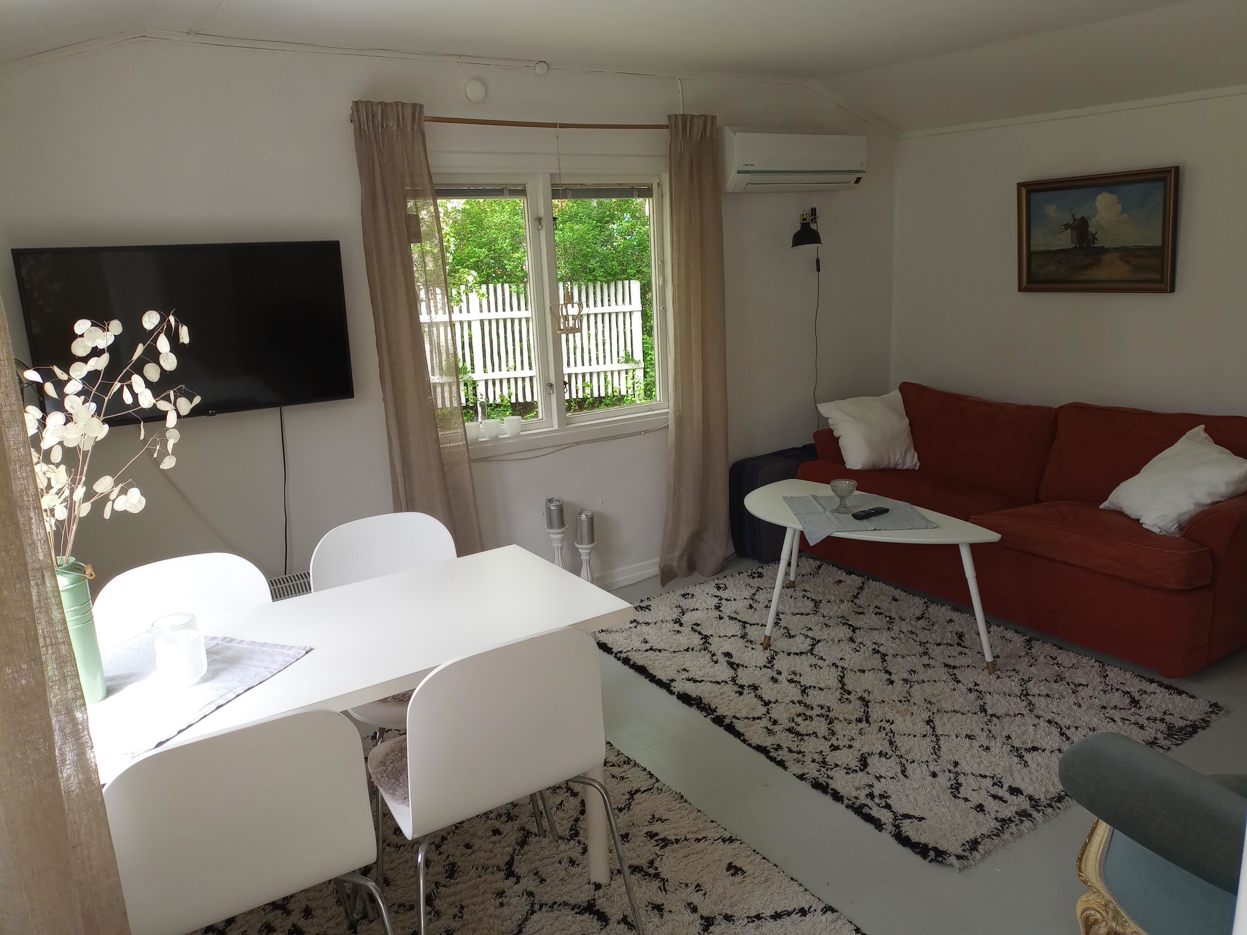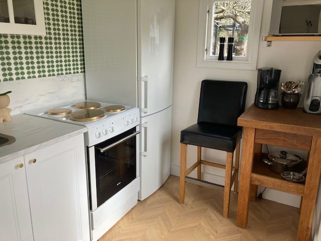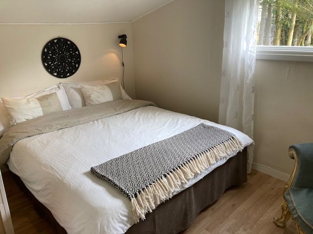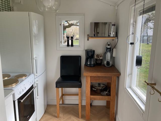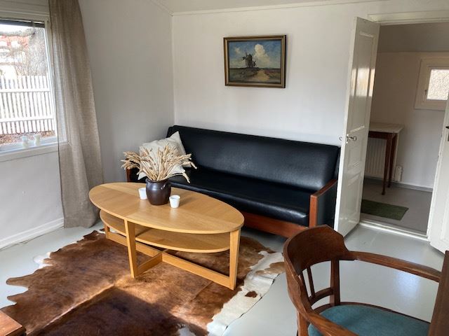 The cottage is from the 20s and has been renovated in stages. Small kitchen with stove 4 plates, fridge and freezer, microwave, coffee maker, kettle, soda stream machine. Bedroom with two beds Living room with sofa bed with two beds, dining table, TV with channel 1,2,4. Bathroom with a room with toilet and a room with shower (low ceilings). Electric heating. Wifi. Own part of the owner's plot. Outdoor furniture and barbecue.