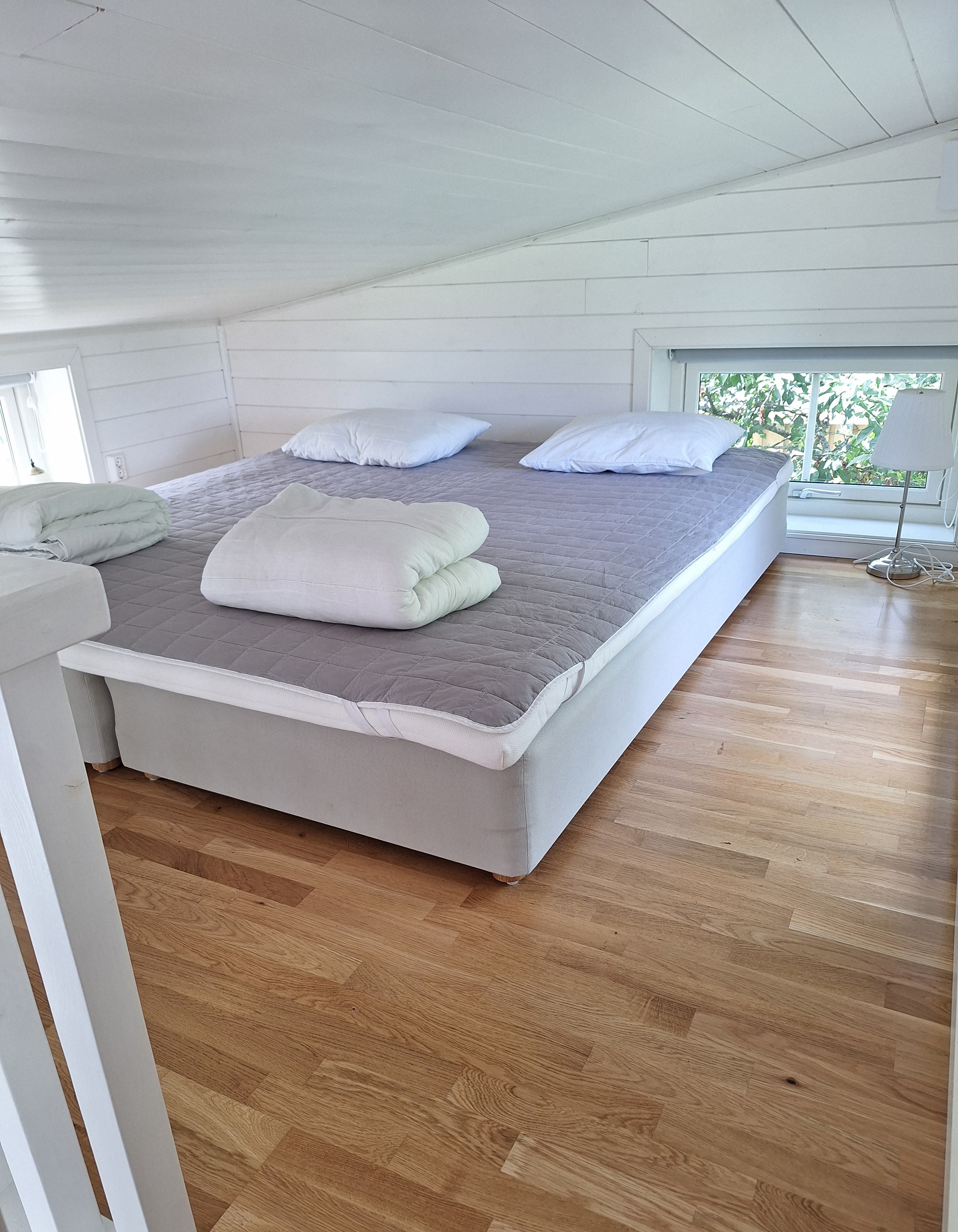 Cottage 25m² with open floor plan and loft for max. 4 people 2 beds + 2 extra beds in sofa bed (max. 3 adults or 2 adults and 2 children) Kitchenette with electric stove with 3 plates, dishwasher, oven & microwave in the same. Fridge (half), freezer compartment 20 L, coffee maker and kettle. Bedroom in the loft with 2 spring beds, low ceiling and steep stairs to the loft. Sofa bed downstairs. TV (channels 1,2,4) Bathroom with shower/WC. Air source heat pump with AC function for both hot and cold days. Shared plot of 1000m². Own outdoor furniture. Grill. WIFI is available. ATTENTION! Sheets and final cleaning are included in the price.